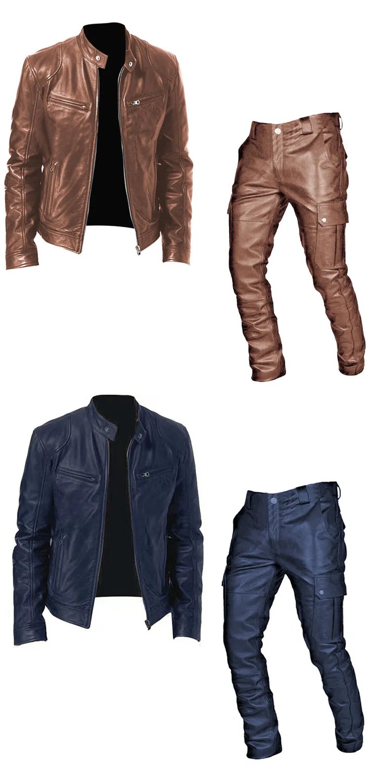 Jesienno-zimowy męski zestaw przeciwdeszczowy z kurtką skórzaną.